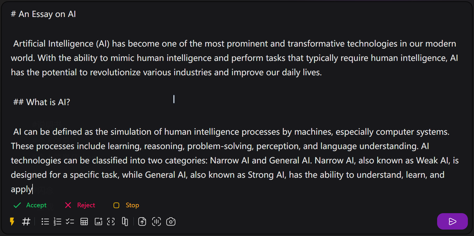 您可以点击接受使用AI写作结果,或拒绝来拒绝它。